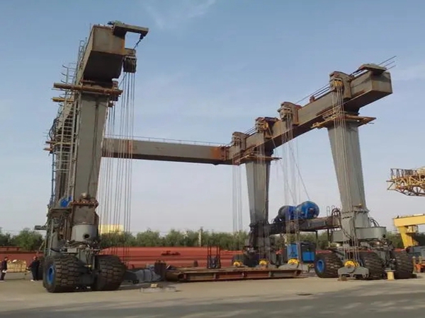 湖北黃石游艇輪胎吊公司是由主結構、走行輪組、起升機構、轉向機構、液壓傳動系統、電氣控制系統等部分組成,主結構構成“匚”形結構,可以搬運超過搬運機自身高度的船艇,采用了電動液壓傳動系統,能在運行中方便地實現無極調速,易于實現過載保護。而主梁與斷梁采用了鉸接形式,易于消除行走于惡劣路況引起的局部應力。