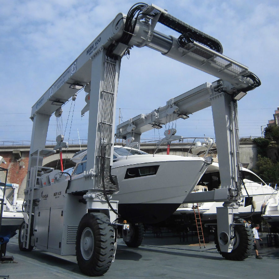 福建莆田游艇輪胎吊生產公司制作的游艇搬運機可以從岸邊水槽中搬運出不同噸位(10噸-800噸)的船只或游艇,用于對這些不同的船只在岸上進行保養、維修或者新造船只的下水工作。它的特性有: